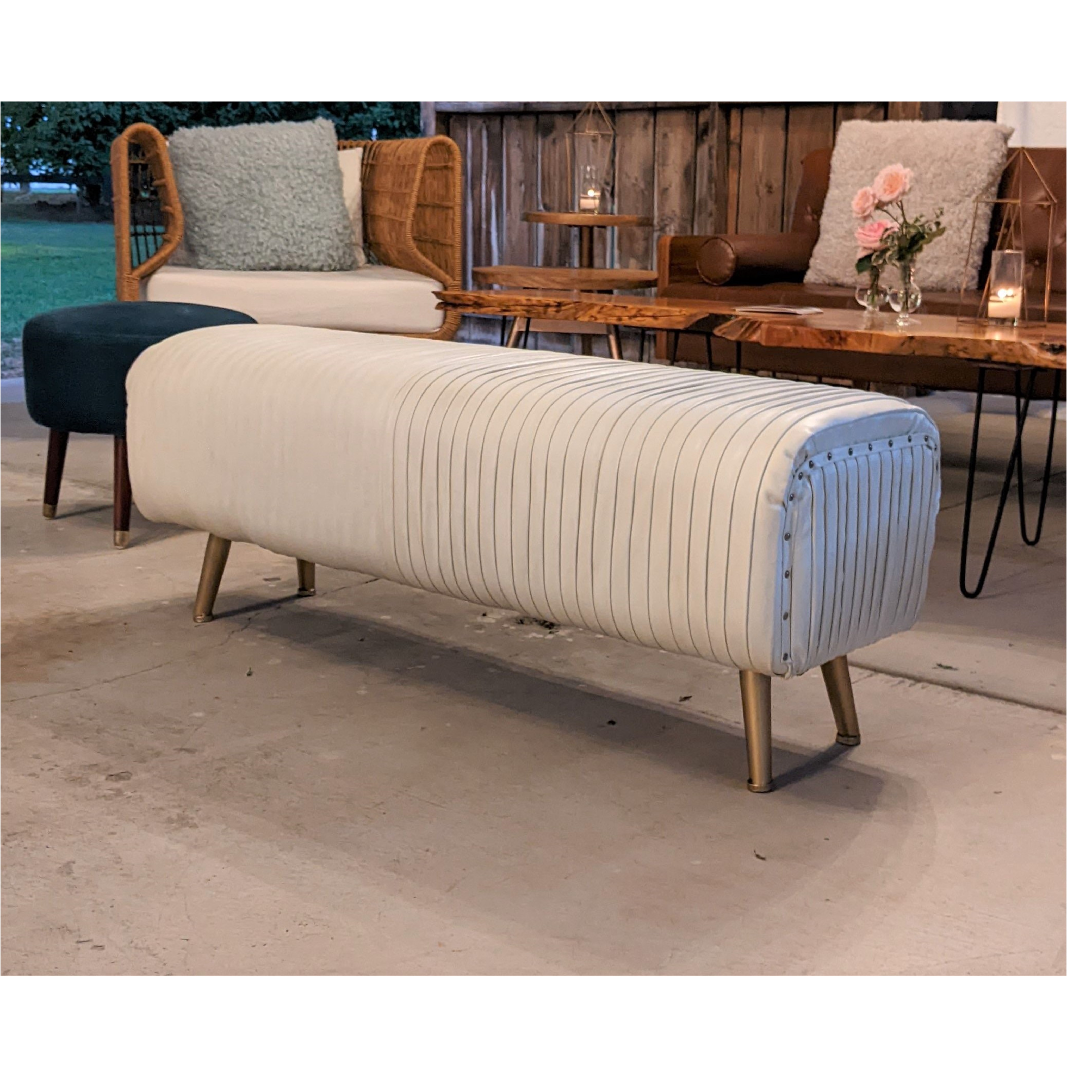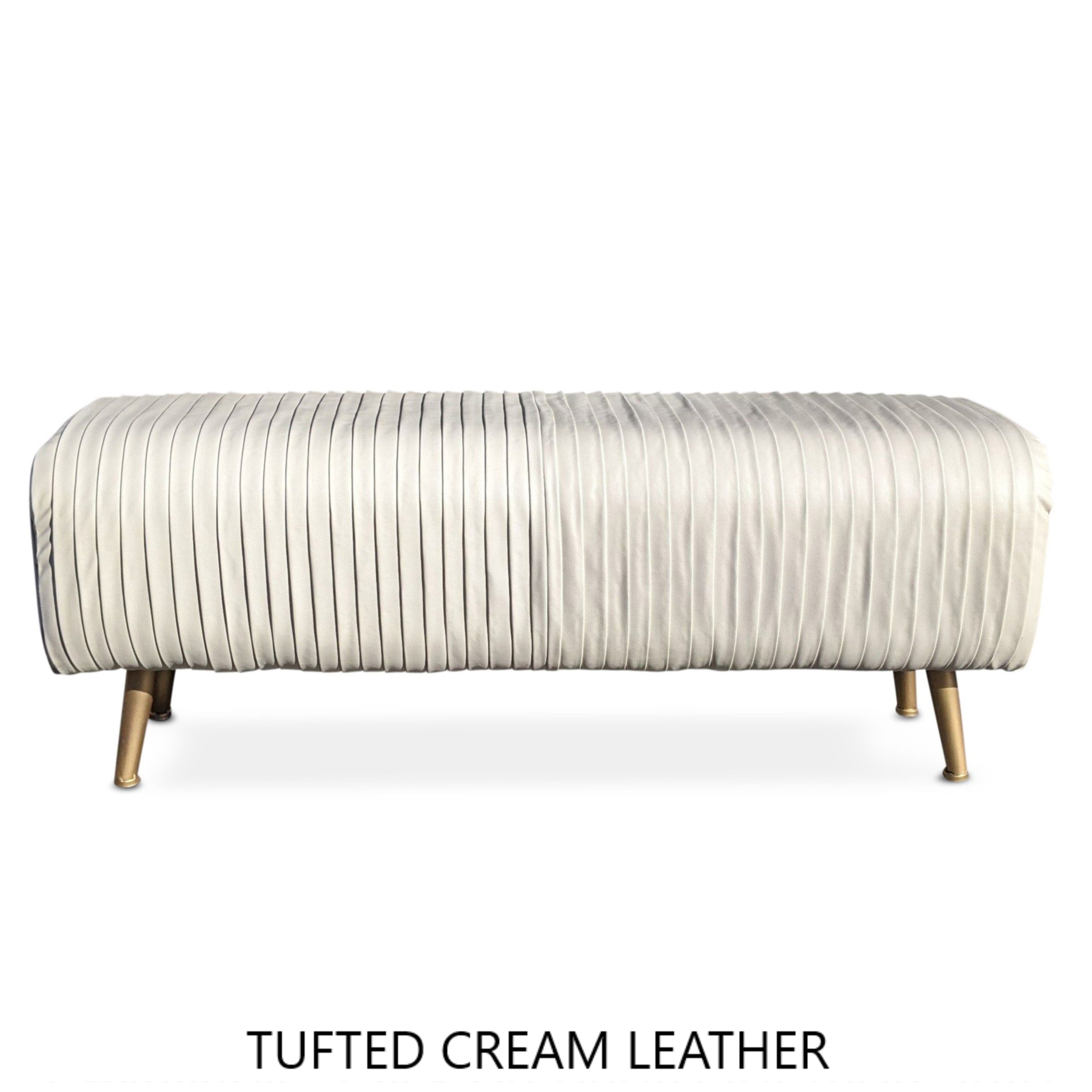 Description: PLEATED CREAM LEATHER w/ GOLD LEGS 48" L x 18" D x 19" Tall